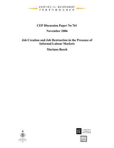 Recessions and policy interventions in labour markets in developing countries are characterized not only by changes in the unemployment rate, but also by changes in the proportion of formal or protected jobs. This reallocation between formal and informal jobs is large and occurs mainly because the job finding rate of formal jobs reacts substantially more than the job finding rate of informal jobs. This paper presents a search and matching model to capture this fact. I assume that firms operate the within firm margin of formality, choosing to legalize only those matches that are good enough to compensate the costs of formality. In this framework, recessions or stricter regulations in the labour market trigger two effects. As expected, they lower the incentives to post vacancies (meeting effect), but also affect the firms’ hiring standards, favouring informal contracts (offer effect). This new channel sheds light on how the actions of policy makers alter the outcomes in an economy with informal jobs. For instance, attempts to protect employment by increasing .ring costs will reallocate workers to informal jobs, where job separation is high. They are also likely to increase unemployment.
