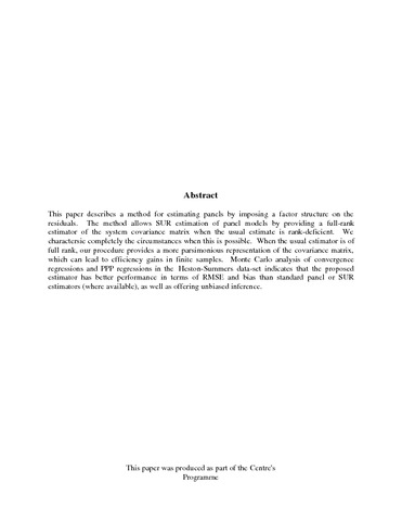 This paper describes a method for estimating panels by imposing a factor structure on the residuals. The method allows SUR estimation of panel models by providing a full-rank estimator of the system covariance matrix when the usual estimate is rank-deficient. We charactersie completely the circumstances when this is possible. When the usual estimator is of full rank, our procedure provides a more parsimonious representation of the covariance matrix, which can lead to efficiency gains in finite samples. Monte Carlo analysis of convergence regressions and PPP regressions in the Heston-Summers data-set indicates that the proposed estimator has better performance in terms of RMSE and bias than standard panel or SUR estimators (where available), as well as offering unbiased inference.