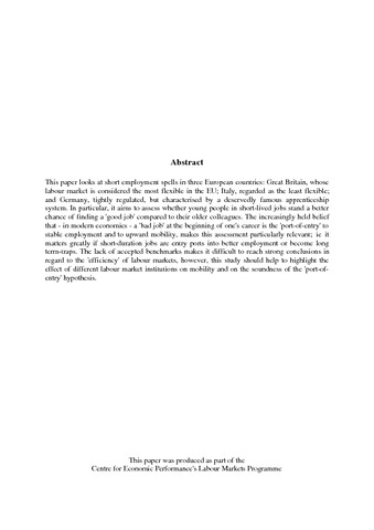 This paper looks at short employment spells in three European countries: Great Britain, whose labour market is considered the most flexible in the EU; Italy, regarded as the least flexible; and Germany, tightly regulated, but characterised by a deservedly famous apprenticeship system. In particular, it aims to assess whether young people in short-lived jobs stand a better chance of finding a ''good job'' compared to their older colleagues. The increasingly held belief that - in modern economies - a ''bad job'' at the beginning of one''s career is the ''port-of-entry'' to stable employment and to upward mobility, makes this assessment particularly relevant; ie it matters greatly if short-duration jobs are entry ports into better employment or become long term-traps. The lack of accepted benchmarks makes it difficult to reach strong conclusions in regard to the ''efficiency'' of labour markets, however, this study should help to highlight the effect of different labour market institutions on mobility and on the soundness of the ''port-of-entry'' hypothesis.