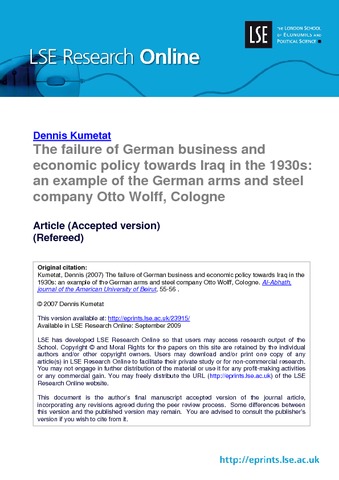 The failure of German business and economic policy towards Iraq in the 1930s: an example of the German arms and steel company Otto Wolff, Cologne