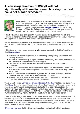 A Newscorp takeover of BSkyB will not significantly shift media power: blocking the deal could set a poor precedent