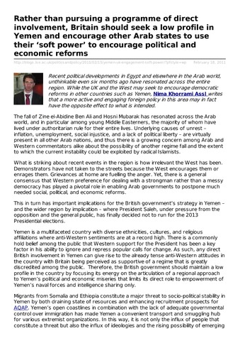 Recent political developments in Egypt and elsewhere in the Arab world, unthinkable even six months ago have resonated across the entire region. While the UK and the West may seek to encourage democratic reforms in other countries such as Yemen, Nima Khorrami Assl writes that a more active and engaging foreign policy in this area may in fact have the opposite effect to what is intended.