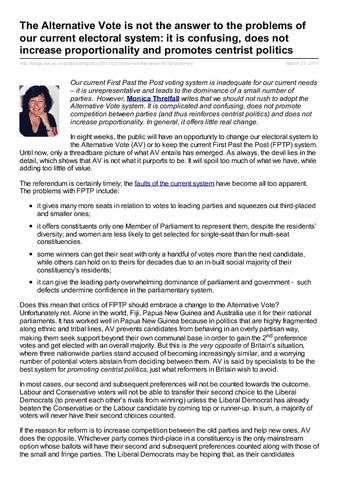 The Alternative Vote is not the answer to the problems of our current electoral system: it is confusing, does not increase proportionality and promotes centrist politics