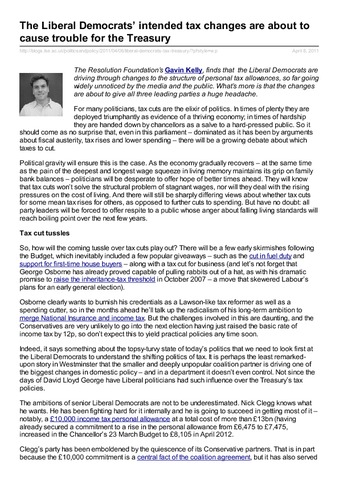 The Resolution Foundation’s Gavin Kelly, finds that the Liberal Democrats are driving through changes to the structure of personal tax allowances, so far going widely unnoticed by the media and the public. What’s more is that the changes are about to give all three leading parties a huge headache.
