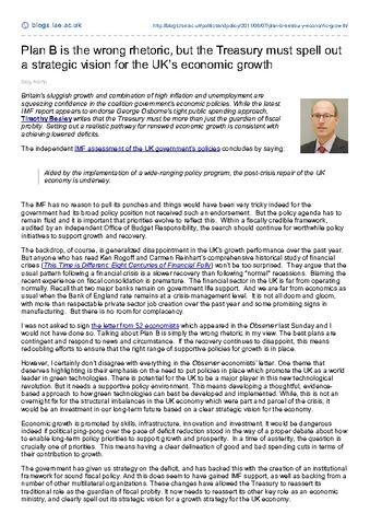 Britain’s sluggish growth and combination of high inflation and unemployment are squeezing confidence in the coalition government’s economic policies. While the latest IMF report appears to endorse George Osborne’s tight public spending approach, Timothy Besley writes that the Treasury must be more than just the guardian of fiscal probity. Setting out a realistic pathway for renewed economic growth is consistent with achieving lowered deficits.