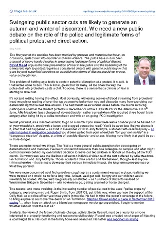 The first year of the coalition has been marked by protests and marches that have, on occasions, spilled over into disorder and even violence. The police have in turn been accused of heavy-handed tactics in suppressing legitimate forms of political dissent. David Mead argues that the preservation of trust in the police and the bolstering of the democratic right to protest requires a considered debate with genuine public buy-in that goes beyond superficial headlines to establish what forms of dissent should we protect, value and legitimise.