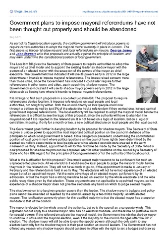 As part of its flagship localism agenda, the coalition government will introduce powers to require certain authorities to adopt the mayoral model currently in place in London. The first step is to impose ‘shadow mayors’ and local referendums on mayors. George Jones and John Stewart write that proposals are actually against the principle of localism, and may even undermine the constitutional position of local government.