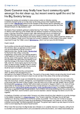 Following the looting and vandalism in areas across London on Monday evening, hundreds of people came out to help clear up the mess and put their neighbourhoods back on track. Amy Mollett writes that this example of ‘Big Society’ spirit is admirable, but the damage caused by disengaged, angry, and bored young people shows that the Prime Minister’s dream of a Big Society is over.