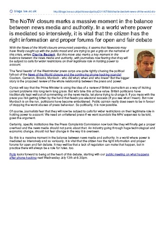 The NoTW closure marks a massive moment in the balance between news media and authority. In a world where power is mediated so intensively, it is vital that the citizen has the right information and proper forums for open and fair debate.