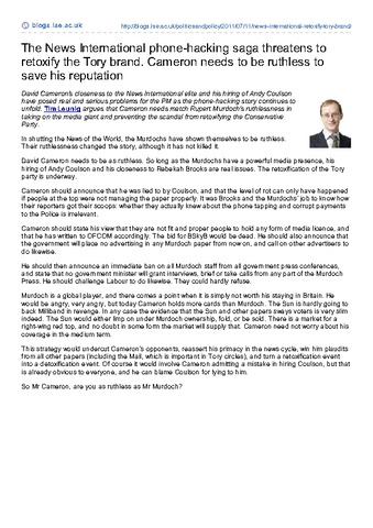 David Cameron’s closeness to the News International elite and his hiring of Andy Coulson have posed real and serious problems for the PM as the phone-hacking story continues to unfold. Tim Leunig argues that Cameron needs match Rupert Murdoch’s ruthlessness in taking on the media giant and preventing the scandal from retoxifying the Conservative Party.