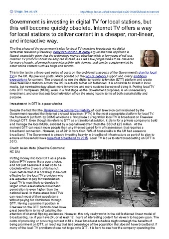 The first phase of the government’s plan for local TV envisions broadcasts via digital terrestrial television (Freeview). Sally Broughton-Micova argues that this approach is flawed, especially given that the technology may be obsolete within a few years of roll-out. Internet TV protocol should be adopted instead, as it will allow programmes to be delivered far more cheaply, allow much more interactivity with viewers, and can be complemented by other online content such as blogs and forums.