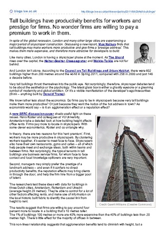 In spite of the global recession, London and many other large cities are experiencing a major period of skyscraper construction. Discussing a new report, Max Nathan finds that tall buildings may make workers more productive and give firms a ‘prestige address’. This makes them more expensive, and therefore more attractive for developers to build.