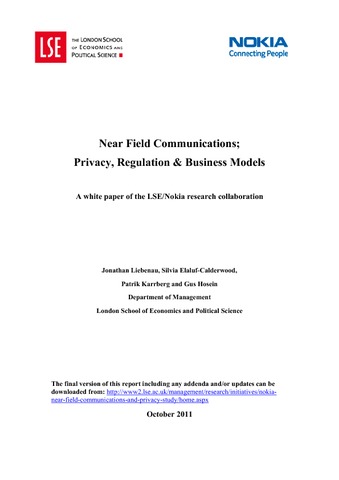 The implications of extended and intensive use of near field communications (NFC) are far reaching for new business applications, for the delivery of public services such as transport, and for public policy. This technology is transformative for a large number of applications and has stimulated innumerable innovative forms, but so far there has been insufficient insight expressed in discussions about its impact and risks. The purpose of these studies is to assess the character and use of contactless payment technologies and the future of NFC with a focus on what are by far its most extensive applications in public transport. We use our evidence to structure a new understanding of the economic, business, legal and policy aspects of its anticipated widespread growth, especially as embodied in mobile devices. NFC wireless technology allows information to be exchanged, via radio signals, between two NFCenabled devices over short distances. To date the most extensively used form of payment is contactless travel card tickets. However, NFC is increasingly being used on mobile phones with an 'electronic wallet' function, which allows people to make payments and manage other forms of exchange. The lack of insightful discussion of these far reaching effects brings significant risks. They include a new level of intensity of the pressure to undermine (or alter) principles and practices of safeguarding privacy. They raise concerns about the special status of children and other unwary users whose privacy might be compromised. They also intensify the concern we might have about breaches of data security or data loss, given the ability of NFC data to include location as well as payment information. We review the regulations and policies governing NFC in Europe and Asia and the incentives and barriers to the commercial development of NFC. The use of contactless payment technologies in public transport ticketing schemes – such as the Oyster card in London and the Octopus card in Hong Kong provide case studies for the research. Our investigation is based on legal and business analyses, case studies and considerations of the changing functionalities of NFC. We have also interviewed numerous experts in regulation, policy and business about trends in investment and policy.An overriding concern is that NFC will fail to achieve its potential. Until problems such as those associated with privacy and regulations are overcome there will be insufficient progress on extending the business models in ways stakeholders such as public authorities, consumers and investors expect. Given the large scale of activities, any such delay would be extremely costly both in terms of investments and in terms of the expectations of this element of the ubiquitous digital infrastructure. This report has eight sections. The first section covers the introduction to the research. Section two is a summary of the aspects to be taken into account for NFC and its application for public transport. Section 3 describes the theoretical foundations of the analysis. Section 4 focuses on the contentious issues emerging from NFC, privacy and business models. Section 5 discusses the implications of extending the NFC public transport experiences to other business cases. Section 6 presents our view on the future of NFC and its competitive environment. Section 7 addresses the key relationships that will determine NFC’s future, and section 8 presents our conclusions and our views on policy implications. We also present our case about the implications for business models development. The document concludes with an appendix of cases studied.