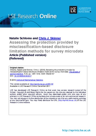 | Keywords | disclosure risk, identification risk, log linear model, measurement error, post randomization method, data swapping |