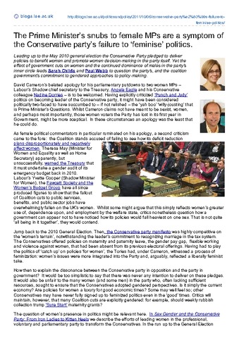 Leading up to the May 2010 general election the Conservative Party pledged to deliver policies to benefit women and promote women decision-making in the party itself. Yet the effect of government cuts on women and the continued dominance of males in the party’s inner circle leads Sarah Childs and Paul Webb to question the party’s, and the coalition government’s commitment to gendered approaches to policy-making.