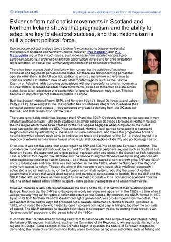 Contemporary political analysis tends to draw few comparisons between nationalist movements in Scotland and Northern Ireland. However, Eve Hepburn and P. J. McLoughlin argue that in both cases, such movements have adopted variously pro-European positions in order to benefit from opportunities for aid and for greater political representation, and have thus successfully moderated their nationalist ambitions.