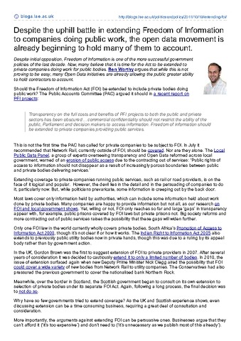 Despite initial opposition, Freedom of Information is one of the more successful government policies of the last decade. Now, many believe that it is time for the Act to be extended to private companies doing work for public bodies. Ben Worthy argues that while this is not proving to be easy, many Open Data initiatives are already allowing the public greater ability to hold contractors to account.