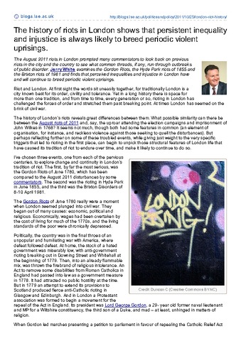 The August 2011 riots in London prompted many commentators to look back on previous riots in the city and the country to see what common threads, if any, run through outbreaks of public disorder. Jerry White examines the Gordon Riots, the Hyde Park riots of 1855 and the Brixton riots of 1981 and finds that perceived inequalities and injustice in London have and will continue to breed periodic violent uprisings.
