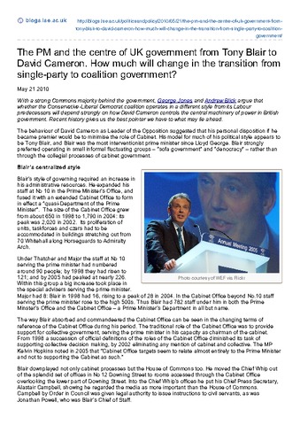 The PM and the centre of UK government from Tony Blair to David Cameron: how much will change in the transition from single-party to coalition government?