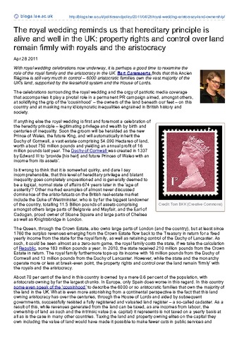 With royal wedding celebrations now underway, it is perhaps a good time to rexamine the role of the royal family and the aristocracy in the UK. Bart Cammaerts finds that this Ancien Régime is still very much in control – 6000 aristocratic families own the vast majority of the UK’s land, supported by the leasehold system and the House of Lords.