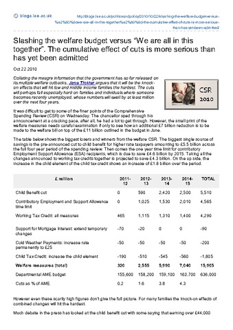 Slashing the welfare budget versus “we are all in this together”: the cumulative effect of cuts is more serious than has yet been admitted