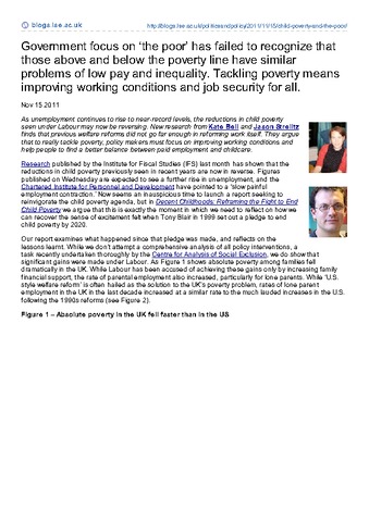 As unemployment continues to rise to near-record levels, the reductions in child poverty seen under Labour may now be reversing. New research from Kate Bell and Jason Strelitz finds that previous welfare reforms did not go far enough in reforming work itself. They argue that to really tackle poverty, policy makers must focus on improving working conditions and help people to find a better balance between paid employment and childcare.