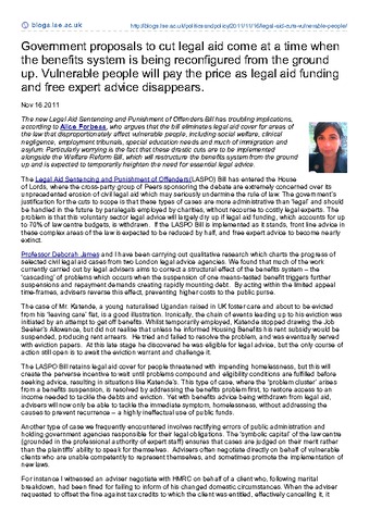 The new Legal Aid Sentencing and Punishment of Offenders Bill has troubling implications, according to Alice Forbess, who argues that the bill eliminates legal aid cover for areas of the law that disproportionately affect vulnerable people, including social welfare, clinical negligence, employment tribunals, special education needs and much of immigration and asylum. Particularly worrying is the fact that these drastic cuts are to be implemented alongside the Welfare Reform Bill, which will restructure the benefits system from the ground up and is expected to temporarily heighten the need for essential legal advice.