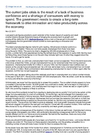 The current jobs crisis is the result of a lack of business confidence and a shortage of consumers with money to spend: the government needs to create a long-term framework to drive innovation and raise productivity across the economy.