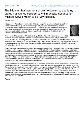 Introduced by the Labour government in 2002, the campaign to convert schools to Academy status has been taken up with considerable gusto by the Education Secretary, Michael Gove. Using data provided by the Department for Education, John Fowler finds that while there were considerable applications for conversion to Academy status in the spring, the number of applications have now dropped significantly. It may take decades before all schools achieve Academy status.