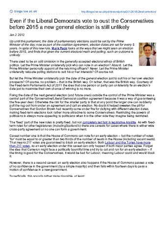 Up until this parliament, the date of parliamentary elections could be set by the Prime Minister of the day; now as part of the coalition agreement, election dates are set for every 5 years. In spite of this new rule, Mark Pack looks at the ways that we might seen an election before 2015, and finds that given the current electoral math and polling, such an outcome is unlikely.