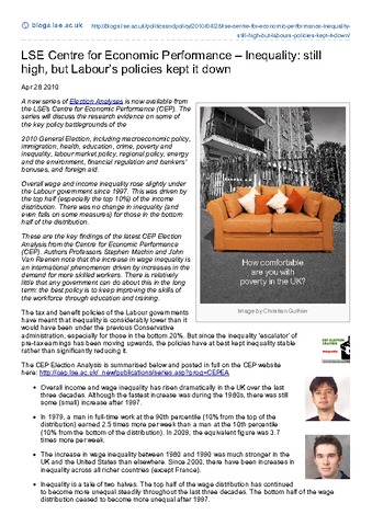 LSE centre for economic performance – inequality: still high, but labour’s policies kept it down