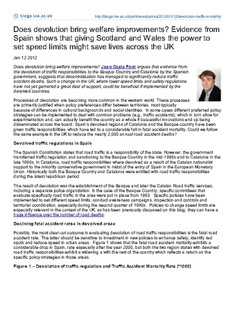 Does devolution bring welfare improvements? Joan Costa Font argues that evidence from the devolution of traffic responsibilities to the Basque Country and Catalonia by the Spanish government, suggests that decentralisation has managed to significantly reduce traffic accident deaths. Such a change in the UK, where lower speed limits and safety regulations have not yet garnered a great deal of support, could be beneficial if implemented by the devolved countries