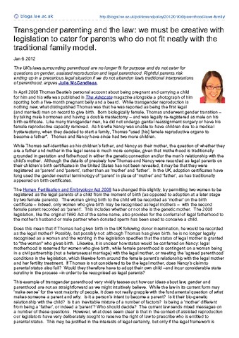 Transgender parenting and the law: we must be creative with legislation to cater for parents who do not fit neatly with the traditional family model