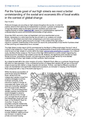 Profound changes are occurring on high streets throughout the country. In order for policies aimed at their planning and stewardship to succeed, a greater understanding of how high streets adapt to changing economic conditions and serve their neighbourhoods is needed. Suzanne Hall argues for a multidisciplinary approach in understanding the social and economic particularities of high streets.