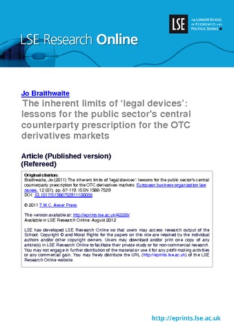 The inherent limits of ‘legal devices’: lessons for the public sector's central counterparty prescription for the OTC derivatives markets