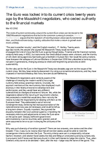 The roots of current controversy around the current Euro crisis can be traced to the 1992 Maastricht negotiations that led to the common currency’s creation. Kevin Featherstone argues that the rejection of neo-Keynesian ideas was fundamental then, and finds echoes today in policy attitudes that make a return to growth even more unlikely.