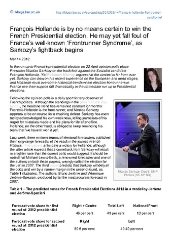 François Hollande is by no means certain to win the French Presidential election. He may yet fall foul of France’s well-known ‘Frontrunner Syndrome’, as Sarkozy’s fightback begins.