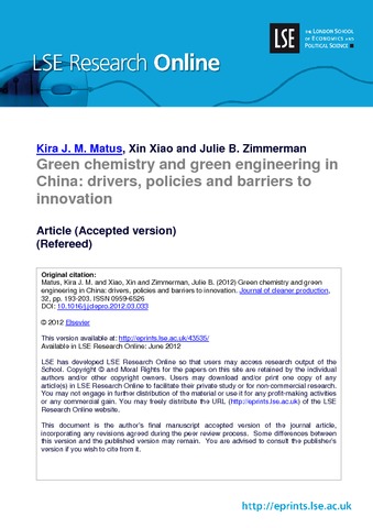 Green chemistry and green engineering in China: drivers, policies and barriers to innovation