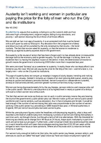Scarlet Harris argues that austerity is failing to cut the nation’s debt and has delivered high unemployment, stagnant wages, falling living standards, and poverty – with women bearing the brunt force of all these effects.