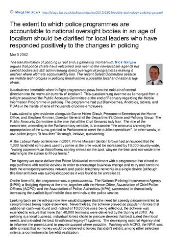 The transformation of policing is real and is gathering momentum. Nick Gargan argues that police chiefs have welcomed and risen to the new localism agenda but central bodies are still administering direct oversight of programmes making it unclear where ultimate accountability lies. The recent Select Committee session on mobile technologies in policing foreshadows a possible local and national tug-of-war.