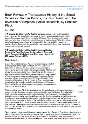 A Transatlantic History of the Social Sciences helps us better understand how and in what way the social sciences came to occupy a central place in universities across Europe and North America. Author Christian Fleck shows that the social sciences were born in order to help make sense of a complex and changing world, yet ultimately their very shape was structured by the very world they sought to explain. Daniel Sage finds the book to be essential reading for anyone interested in the origins of social research