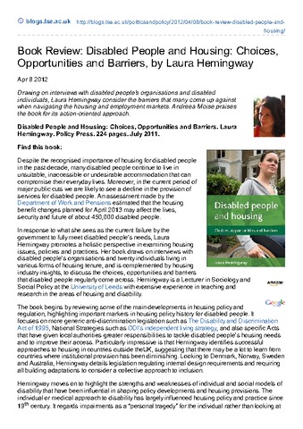 Book review: disabled people and housing: choices, opportunities and barriers, by Laura Hemingway