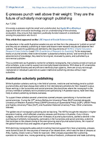 E-presses punch well above their weight:They are the future of scholarly monograph publishing