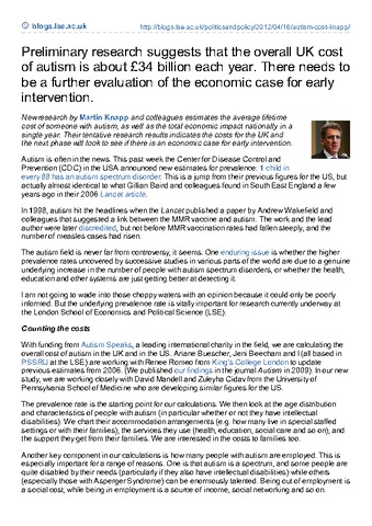 New research by Martin Knapp and colleagues estimates the average lifetime cost of someone with autism, as well as the total economic impact nationally in a single year. Their tentative research results indicates the costs for the UK and the next phase will look to see if there is an economic case for early intervention.