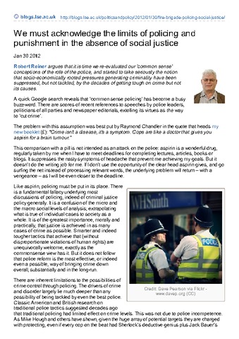 Robert Reiner argues that it is time we re-evaluated our ‘common sense’ conceptions of the role of the police, and started to take seriously the notion that socio-economically rooted pressures generating criminality have been suppressed, but not tackled, by the decades of getting tough on crime but not its causes.