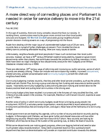 In this age of austerity, there are many complex issues that face our society. In tackling them, communities need to be given more control over their local public services and budgets. Sir Merrick Cockell advocates giving neighbourhoods greater decision making powers as a way of progressing into the future.