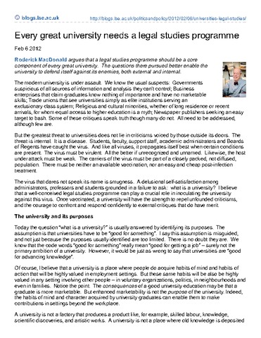 Roderick MacDonald argues that a legal studies programme should be a core component of every great university. The questions there pursued better enable the university to defend itself against its enemies, both external and internal.