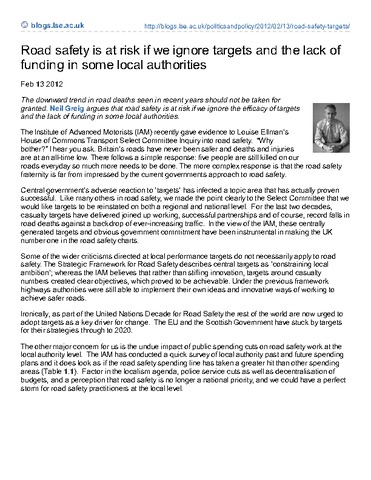 The downward trend in road deaths seen in recent years should not be taken for granted. Neil Greig argues that road safety is at risk if we ignore the efficacy of targets and the lack of funding in some local authorities.