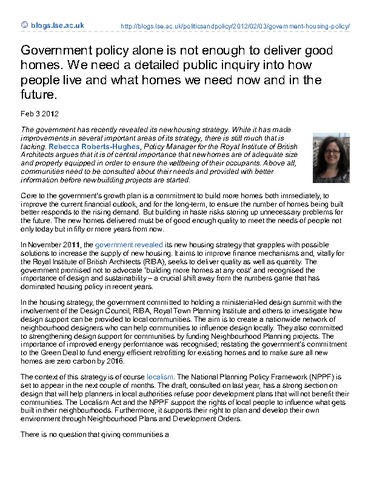 The government has recently revealed its new housing strategy. While it has made improvements in several important areas of its strategy, there is still much that is lacking. Rebecca Roberts-Hughes, Policy Manager for the Royal Institute of British Architects argues that it is of central importance that new homes are of adequate size and properly equipped in order to ensure the wellbeing of their occupants. Above all, communities need to be consulted about their needs and provided with better information before new building projects are started.