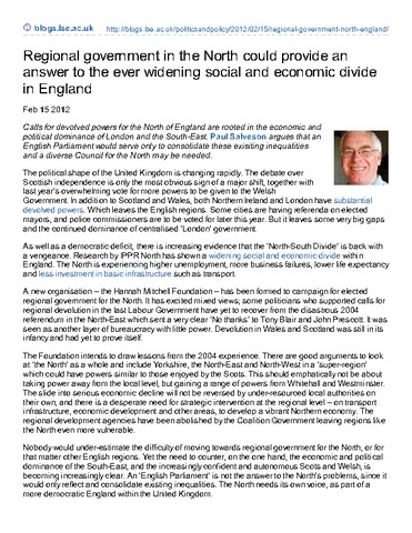 Regional government in the North could provide an answer to the ever widening social and economic divide in England